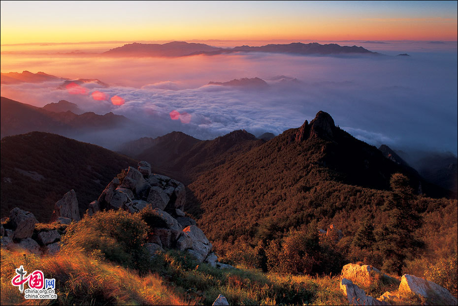 當(dāng)北京的第一縷陽光從這里升起。站在海拔2118米的頂峰平臺上,遙望東方,天際中開始露出幾抹灰色的浮云,隨后不斷地升騰、擴大,繼而天邊漸紅,紅色越來越深,范圍越來越大,曙光漸露,丹霞輝映,把整個東方都變成濃濃的紅色。山峰在云霧中時隱時現(xiàn),彩云在天際間變幻,有時像奔馳的駿馬,有時像仙女飄逸,有時像玉樹瓊宮……千姿百態(tài),遐想無窮。猛然,比紅色的彩云更火紅、更光亮、更鮮艷的太陽露出了一條邊弧,緩緩上升。四周的云霧似乎忍受不了她那光茫的照射而淡化、隱退,太陽則很快掙脫了云霧與夜色的纏繞,迅速地上升,躍出天邊。霎時,一輪紅日噴薄而出,金光四射,霞光瑞氣,照徹天宇,山巒、萬樹沐浴著朝陽的金輝,令人眼花繚亂。舉目四望,朝霞映照下的霧靈山,群峰起伏,云霧如海,波濤洶涌,九曲十八彎的旅游公路似戲水游龍,在峰巒間若隱若現(xiàn)。