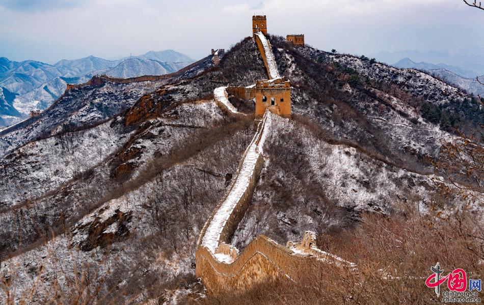 春雪飄灑,一朵朵相擁著落下,氣溫驟降,給人帶來一絲涼意。金山嶺海拔700米,長城依山憑險,起伏跌宕于山水之間,形勢極為雄奇。金山嶺長城是明代修筑的一段長城,西起歷史上著名的關口古北口,東至高聳入云的望京樓,全長10.5公里,沿線設有大小關隘5處,敵樓67座,烽燧2座,因其視野開闊,敵樓密集,景觀奇特,建筑藝術精美,軍事防御體系健全,保存完好而著稱于世。