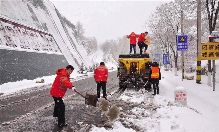 華池公路段在重點(diǎn)路段撒融雪劑和防滑料。(省交通廳供圖)