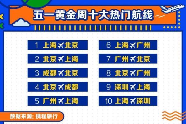 《報告》稱,今年五一期間,消費者跨省出游意愿強(qiáng)烈,攜程機(jī)票單日訂單量對比2019年同期最高增幅約28%。上海-北京、北京-上海、成都-北京、北京-成都、廣州-上海、上海-廣州、廣州-北京、北京-廣州、深圳-上海、上海-深圳為“五一”黃金周十大熱門航線。