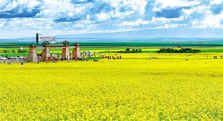 沿著國道227行走,放眼望去,遠(yuǎn)處祁連山脈高峰聳立,近處起伏的山丘高低錯(cuò)落,山間綠草如茵,色彩斑斕的野花星星點(diǎn)點(diǎn)播撒在綠草之中。山坡上點(diǎn)綴的牛羊安靜地吃草,呈現(xiàn)出一派安靜祥和的田野風(fēng)光。最耀眼的當(dāng)屬這里的油菜花,處處可見金黃一片,成為七月河西走廊一道亮麗的風(fēng)景。