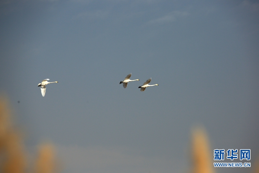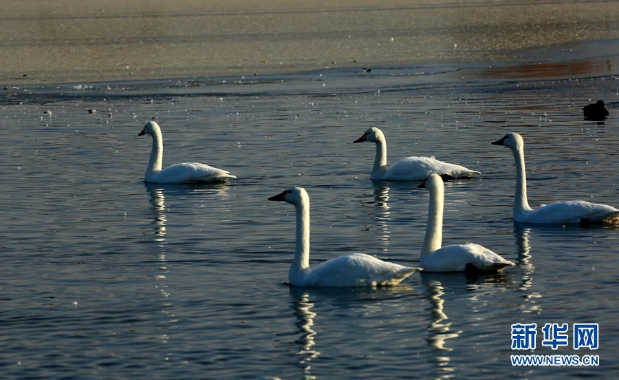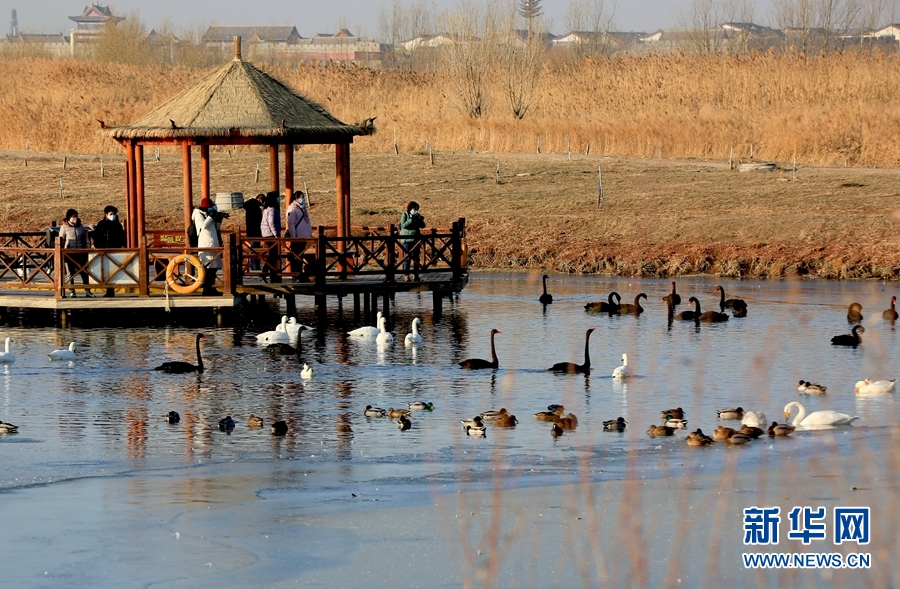 冬日清晨的甘肅省張掖國(guó)家濕地公園里碧波蕩漾,成群的白天鵝、黑天鵝等鳥類聚在一起游弋嬉戲,歡騰跳躍,成為一道亮麗的風(fēng)景線,吸引眾多游客觀賞拍照。新華網(wǎng)發(fā)(陳禮 攝)