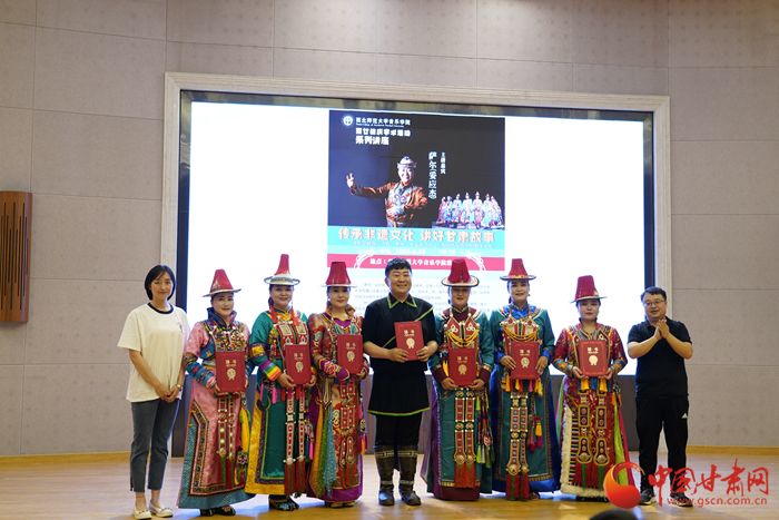 中國甘肅網(wǎng)7月1日訊 近日,甘肅裕固族歌唱組合薩爾組合主唱薩爾帶著他的裕固族伙伴們走進西北師范大學音樂學院,進行“課程思政教學實踐”——《裕固族民歌中的服飾文化》交流分享活動。同時,西北師范大學音樂學院副院長晏曉東為七位裕固族民間音樂傳播者頒發(fā)了音樂學院聘書。