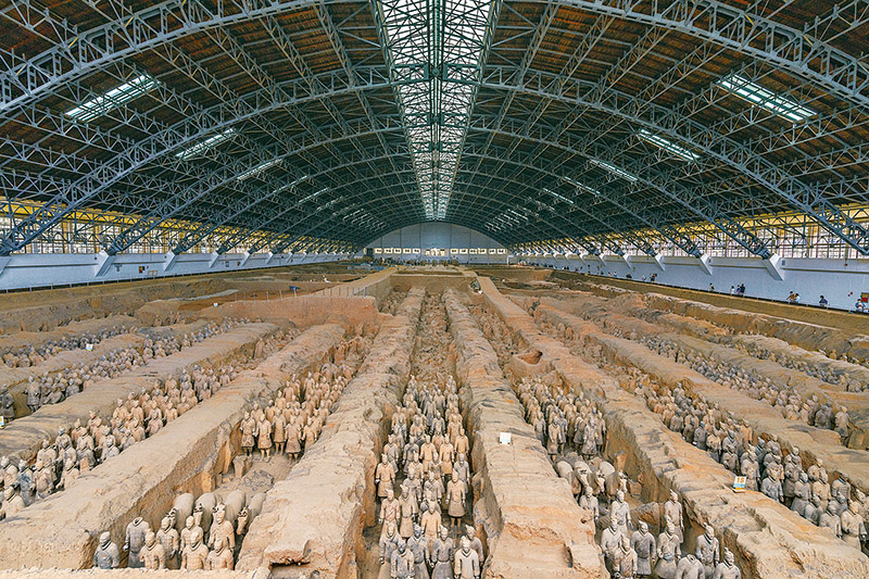 秦始皇陵是中國歷史上第一個(gè)多民族的中央集權(quán)國家的皇帝秦始皇于公元前246年至公元前208年?duì)I建的。作為秦始皇陵陪葬墓坑之一的兵馬俑坑于1974年被發(fā)現(xiàn),被譽(yù)為“世界第八大奇跡”。圖為秦始皇兵馬俑博物館一號(hào)坑全景?!∪嗣駡D片 丁俊豪/攝