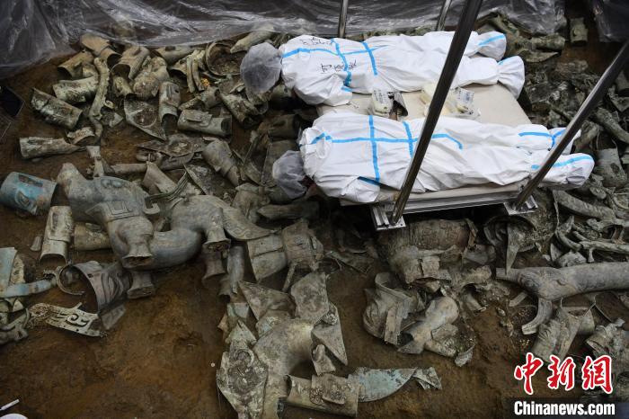 8號祭祀坑等待提取的青銅神獸。張浪 攝