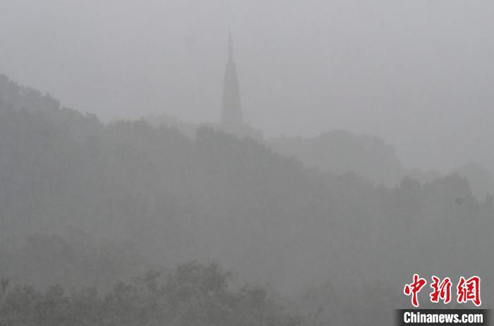 圖為西湖保俶塔在大雨中若隱若現(xiàn)?!⊥鮿偂z