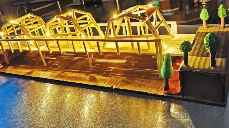 “平時去看中山橋只覺得它很美,現(xiàn)在覺得當時建造它一定很不容易。”馬靜怡同學(xué)和媽媽用一次性筷子制作的中山橋模型,與實物外觀頗為相似,為了呈現(xiàn)中山橋拱形鋼架的效果,馬靜怡裁筷子再拼粘費了一番工夫。大橋模型制作好了,她對中山橋也有了更深的認識。