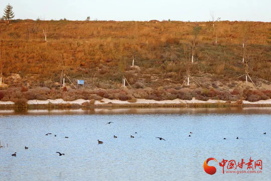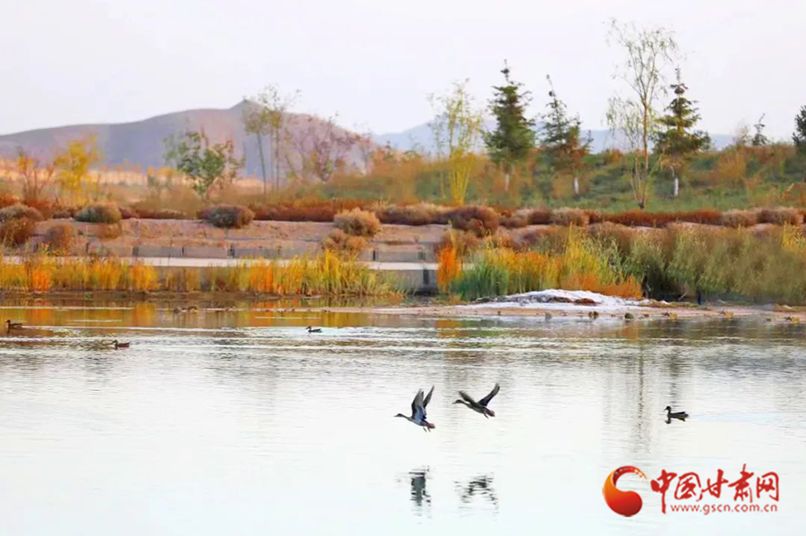 10月的蘭州新區(qū)水阜河,天氣微涼、秋色漸濃。成群的灰鶴、野鴨等野生鳥類棲息覓食、飛鳥嬉戲。每到傍晚,呈現(xiàn)出落霞與孤鶩齊飛,秋水共長天一色的美景。
