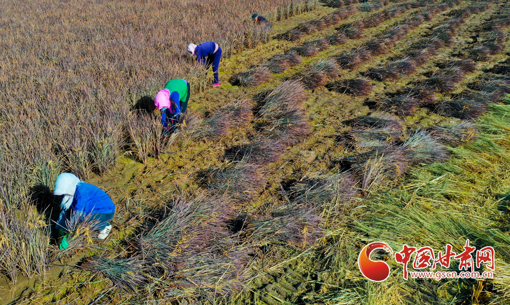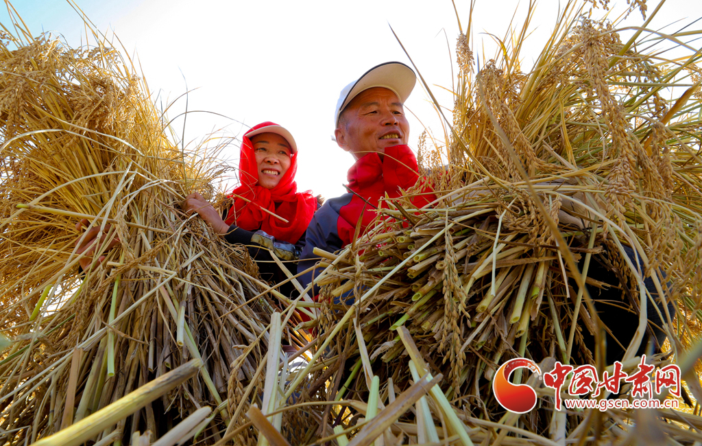 10月21日,位于祁連山下的甘肅省張掖市甘州區(qū)烏江鎮(zhèn)新河田園綜合體內,農(nóng)戶們正在收割成熟的高原水稻。
