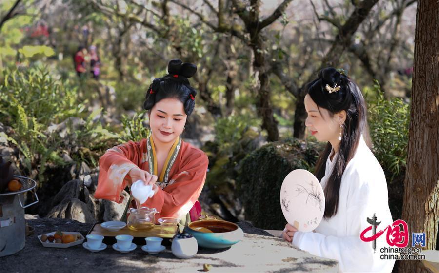 一朵梅花寓五福,一山梅花賀新春。梅原里,游客們或賞花祈福、或獨自品溫,或拍照打卡,盡情享受賞梅樂趣。還有不少游客,為了應景,更是穿著古風漢服或少數(shù)民族服飾,沉浸式打卡梅花節(jié),游客林女士說:“古裝配梅花,清麗脫俗,既感受到傳統(tǒng)文化之美,也為賞梅之旅增添了色彩。”