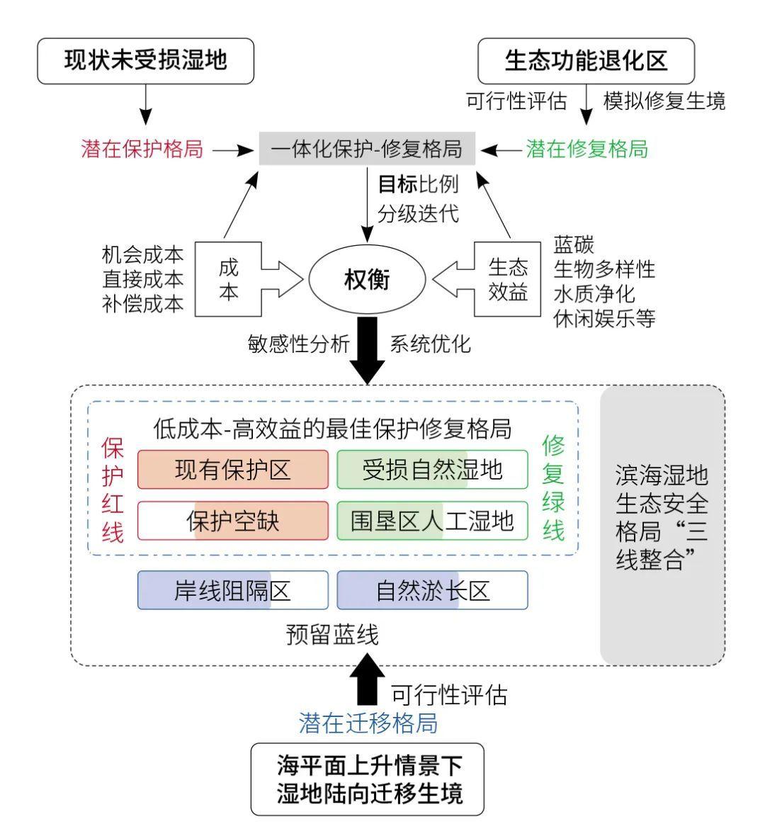 就濱海濕地而言,如果缺乏修復(fù)選址對濱海濕地生態(tài)系統(tǒng)整體格局和生態(tài)功能效益影響的系統(tǒng)評估和優(yōu)化,則有可能導(dǎo)致選址不當(dāng),難以在保護殘存自然濕地同時,有效修復(fù)具有潛在生態(tài)系統(tǒng)服務(wù)協(xié)同效應(yīng)的受損濕地。