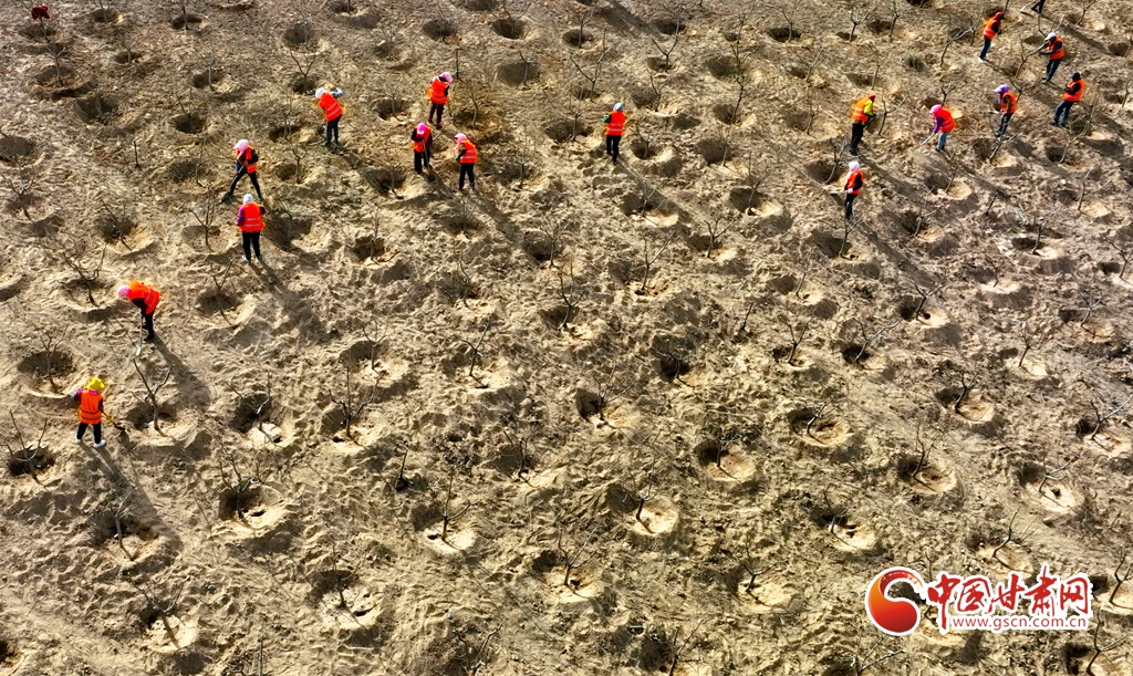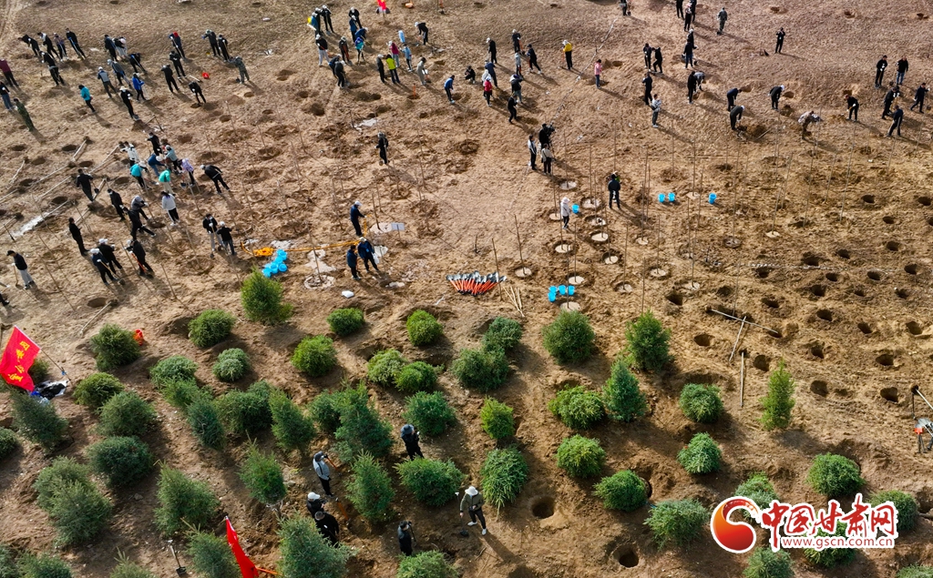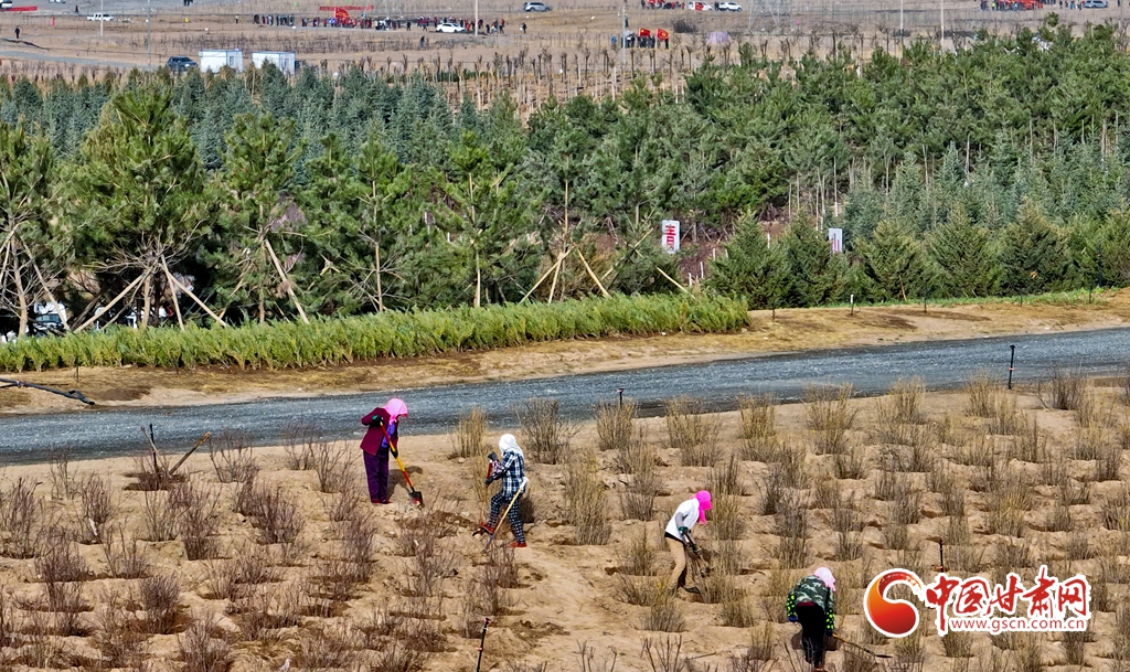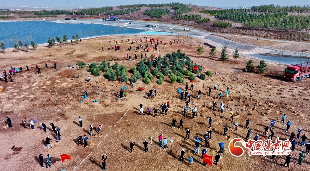 4月11日,在甘肅省張掖市甘州區(qū)黑河西岸黑河灘彩虹林海生態(tài)造林示范區(qū)內,眾多干部職工正在植樹。