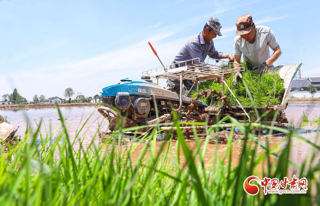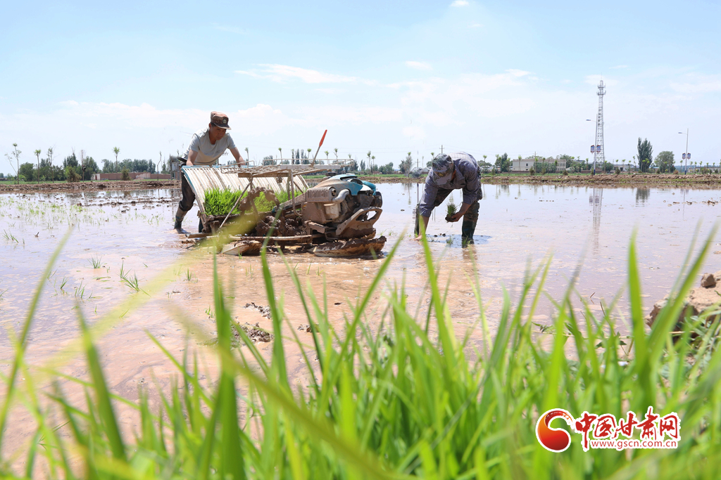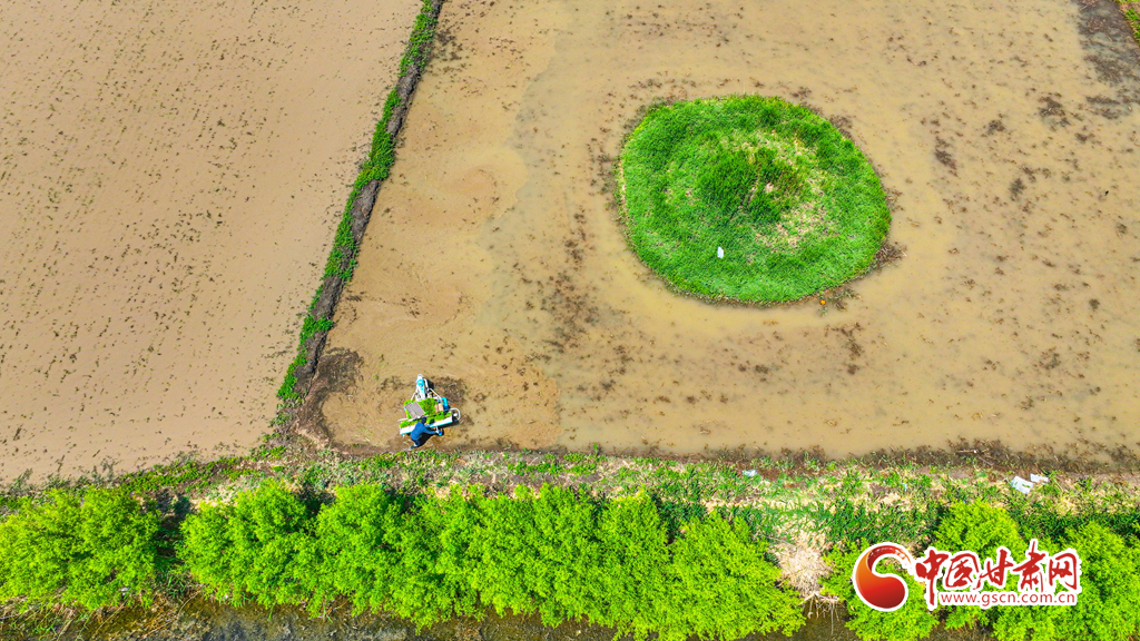 6月5日,祁連山北麓,甘肅省張掖市甘州區(qū)烏江鎮(zhèn)、靖安鄉(xiāng)的稻田里,插秧機(jī)同農(nóng)戶來(lái)回穿梭插秧,2200多畝稻田進(jìn)入了繁忙插播中。