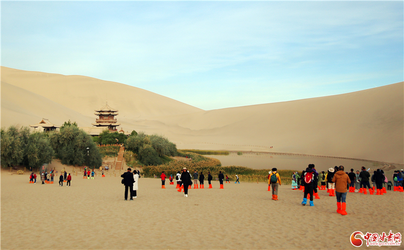 鳴沙山以沙動成響而得名,峰巒危峭,山脊如刃。最早在東漢辛氏《三秦記》中有“河西有沙角山,峰崿危峻,逾于石山,其沙粒粗色黃,有如乾糒……人欲登峰,必步下入穴,即有鼓角之聲,震動人足”的記載。而月牙泉是環(huán)抱在鳴沙山中的一灣清泉,形如玄月,故名“月牙泉”,并形成了鳴沙山月牙泉景區(qū),被譽(yù)為“塞外風(fēng)光之一絕”。