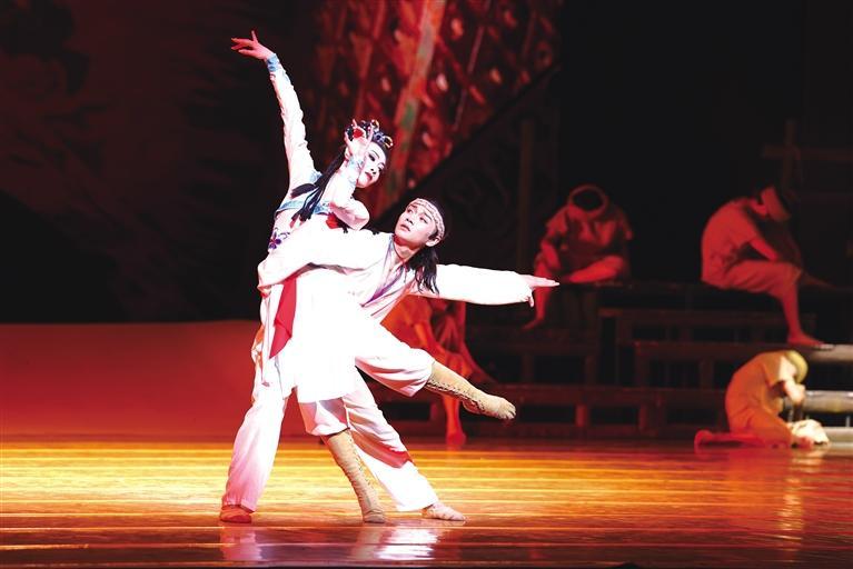 經(jīng)典舞劇《大夢敦煌》是一部富于傳奇色彩的四幕舞劇,首演至今,已獲得中宣部“五個一工程”獎、中國舞蹈“荷花獎”、中國“文華獎”等多個獎項,被譽為中國原創(chuàng)舞劇中的頂級之作,民族舞劇的經(jīng)典之作。當晚,集故事美、音效美、舞美美、表演美于一身的《大夢敦煌》,以一場淋漓盡致、亦夢亦幻的完美演出,收獲了現(xiàn)場觀眾經(jīng)久不息的掌聲。圖為演出現(xiàn)場。