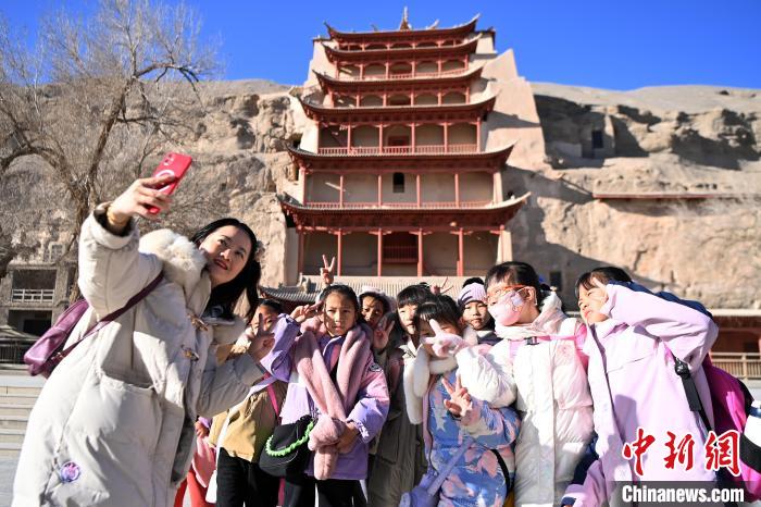 敦煌文化研學(xué)正逐步成為敦煌旅游新時(shí)尚,莫高窟成為“研學(xué)養(yǎng)身養(yǎng)心”的學(xué)堂之一。連日來(lái),中新社記者來(lái)到冬日的莫高窟,沒(méi)有了夏日的人聲鼎沸和如長(zhǎng)龍的隊(duì)伍,多了更多青春面孔,穿著絢麗服飾、背著書(shū)包的學(xué)生,點(diǎn)綴著沉悶的戈壁土黃色。
