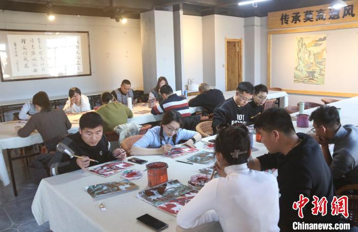 1月11日,來(lái)自云南的學(xué)員在甘肅敦煌小鎮(zhèn)鳴沙書(shū)院研學(xué)課堂學(xué)習(xí)臨摹敦煌壁畫(huà)。張曉亮 攝