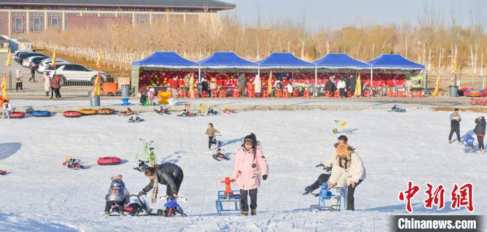 1月7日,游人在敦煌文博冰雪場(chǎng)體驗(yàn)雪地游玩項(xiàng)目。王斌銀 攝