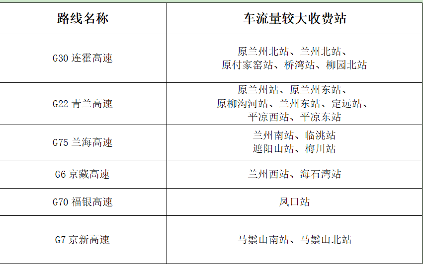 ?。ㄒ唬└咚俟分攸c(diǎn)路段。以蘭州為中心的放射線及其聯(lián)絡(luò)線為重點(diǎn)。如:G30連霍高速,G22青蘭高速,G6京藏高速,G70福銀高速,G75蘭海高速,S1機(jī)場(chǎng)高速等路段及相關(guān)收費(fèi)站、服務(wù)區(qū)。