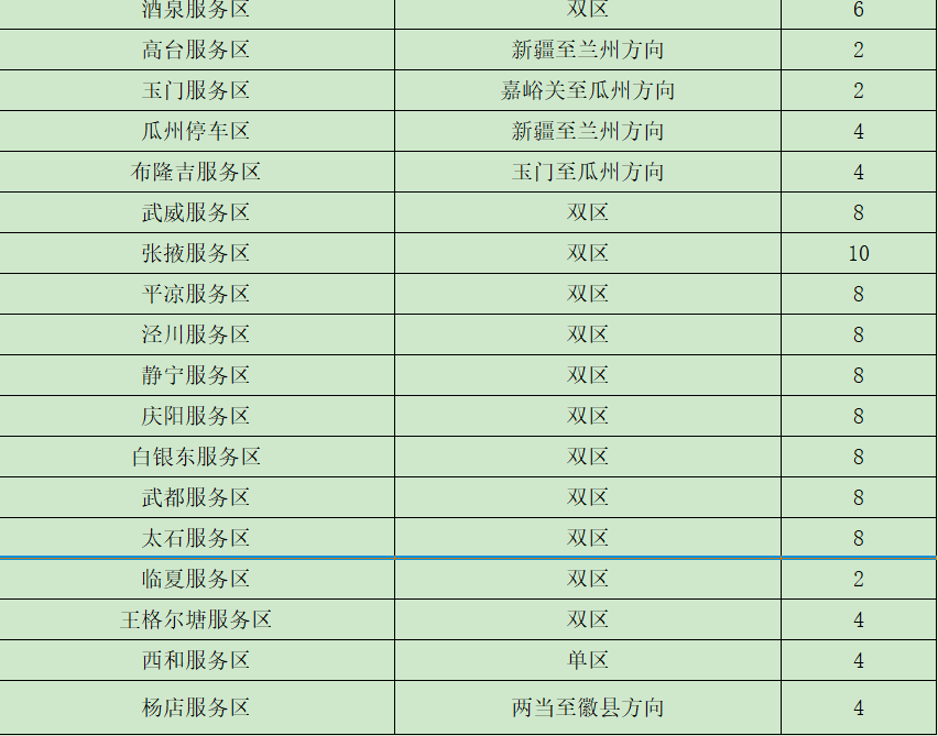 ?。ǘ┲攸c(diǎn)客運(yùn)車站班線。省內(nèi)二級(jí)及以上客運(yùn)站正常營運(yùn),以省會(huì)城市、人口密集市縣的站點(diǎn)及之間的班線為重點(diǎn)。如:蘭州客運(yùn)東站、南站,天水汽車站等站點(diǎn)以及蘭州—定西、蘭州—西峰、臨洮—平川、舟曲—武都、金昌—武威等客運(yùn)班線。 (三)車流量較大服務(wù)區(qū)。預(yù)計(jì)我省車流量較大服務(wù)區(qū)為定西服務(wù)區(qū)、酒泉服務(wù)區(qū)、武威服務(wù)區(qū)、高臺(tái)服務(wù)區(qū)、長城驛服務(wù)區(qū)、靜寧服務(wù)區(qū)、會(huì)寧服務(wù)區(qū)、太石服務(wù)區(qū)、蘭州北服務(wù)區(qū)、接駕嘴服務(wù)區(qū)、永登服務(wù)區(qū)。