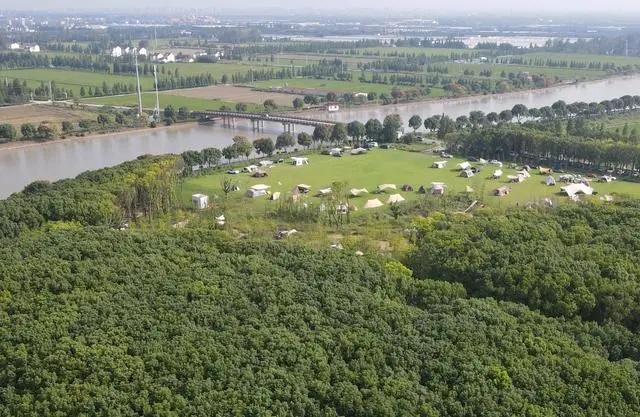 在上海松江區(qū)一處營地,市民游客在河邊草地上搭起帳篷。(2023年9月29日,無人機(jī)照片)。新華社記者 方喆攝