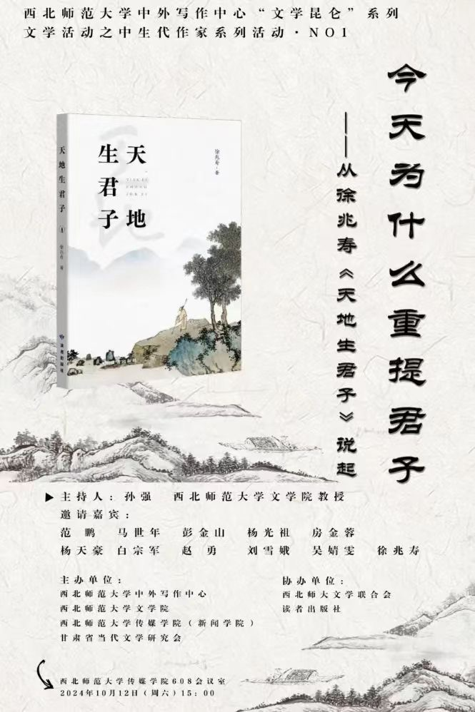 2024年10月12日,由西北師范大學(xué)中外寫(xiě)作中心、西北師范大學(xué)文學(xué)院、西北師范大學(xué)傳媒學(xué)院、甘肅省當(dāng)代文學(xué)研究會(huì)聯(lián)合主辦的“文學(xué)昆侖”之中生代作家系列活動(dòng)“今天為什么重提君子——從徐兆壽《天地生君子》說(shuō)起” 徐兆壽《天地生君子》作品分享會(huì)在西北師范大學(xué)舉辦。