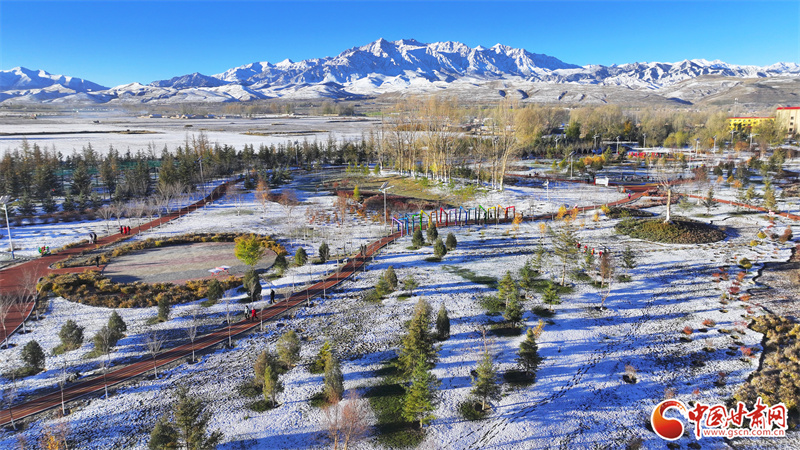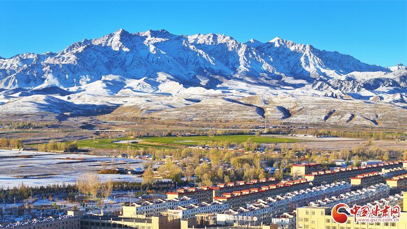 10月22日,雪后初晴的張掖市民樂縣,連綿起伏的祁連山被皚皚白雪覆蓋,整個(gè)縣城一片銀裝素裹,在晨曦的照射下,呈現(xiàn)出一幅多姿多彩、生態(tài)和諧的美麗畫卷。