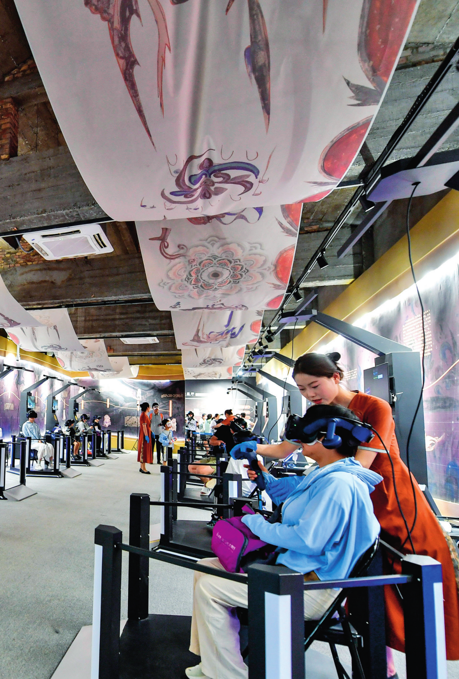 游客在敦煌體驗“尋境敦煌——數字敦煌沉浸展”(2024 年 7 月 22 日攝) 郎兵兵攝 / 本刊