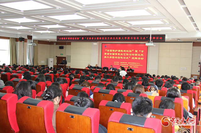 18日下午,由國家圖書館(國家古籍保護中心)主辦,甘肅省圖書館(甘肅省古籍保護中心)與西北民族大學聯合承辦的“古籍保護課程進校園”活動暨“甘肅省古籍修復技藝傳習點”授牌活動在西北民族大學舉行。
