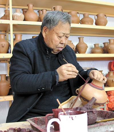 64歲的閻建林(見圖,本報記者趙帥杰攝)是甘肅省級非物質文化遺產(chǎn)項目陶器制作技藝代表性傳承人。走進他位于定西市臨洮縣洮陽鎮(zhèn)河口村的家中,院落里、窗臺上,擺滿了大大小小的陶器,足有上百種。“主要是馬家窯彩陶工藝品,敞口的是盆,帶頸的為罐,耳部安有提手的,還可以稱作壺。”閻建林介紹。