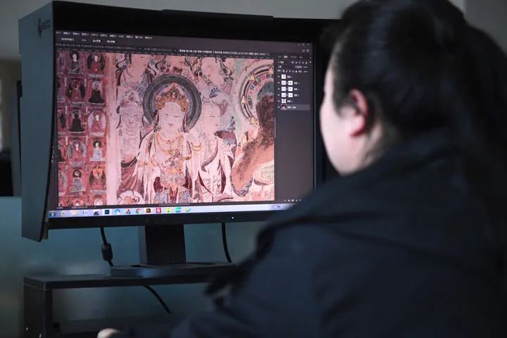 2023年4月25日,敦煌研究院文物數(shù)字化保護(hù)團(tuán)隊圖像處理人員年海麗在拼接壁畫圖像。新華社記者 陳斌 攝