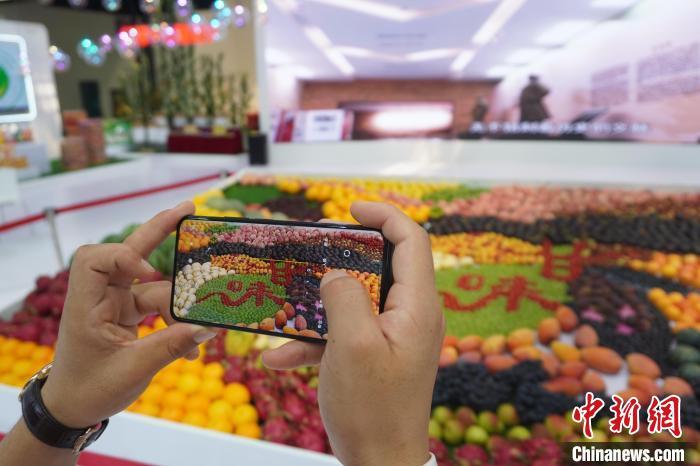 2022年7月10日,第二十八屆中國蘭州投資貿(mào)易洽談會展區(qū)展示甘肅地方特色產(chǎn)品。圖為參觀者手機拍攝用農(nóng)產(chǎn)品拼裝的“甘味”。(資料圖)九美旦增 攝