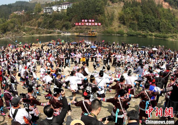 2024年3月11日,在廣西三江侗族自治縣梅林鄉(xiāng),“二月二”侗族大歌節(jié)活動(dòng)吸引游客前來體驗(yàn)侗鄉(xiāng)風(fēng)情。圖為民眾在跳多耶舞?! 蔷殑?nbsp;攝