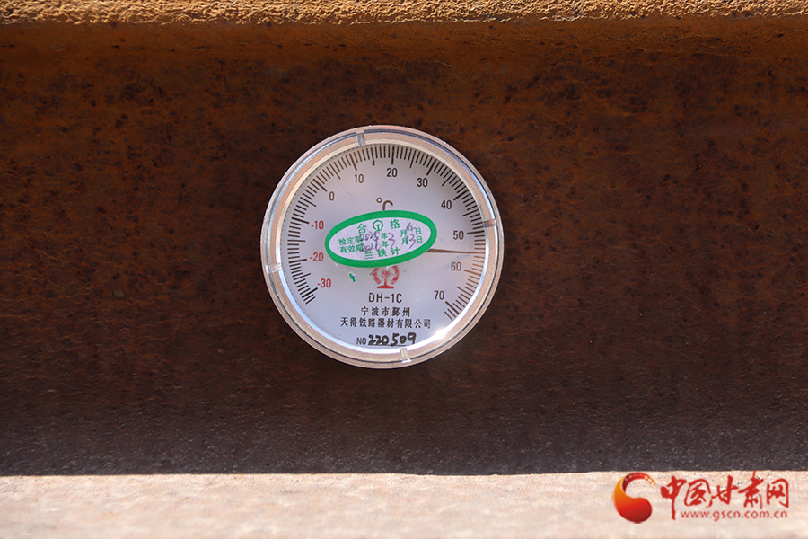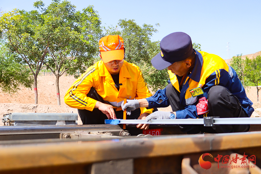 “樊工長,測一下此時的軌溫是多少?”到達(dá)蘭州北編組站下行到達(dá)場后,劉亞雄一邊擦拭著額頭不斷滾落的汗珠,一邊向樊勇喊道。樊勇熟練地將軌溫計(jì)貼在軌腰上,金屬表盤上的指針猶如上了發(fā)條,瞬間直飚半圈定格在54℃!