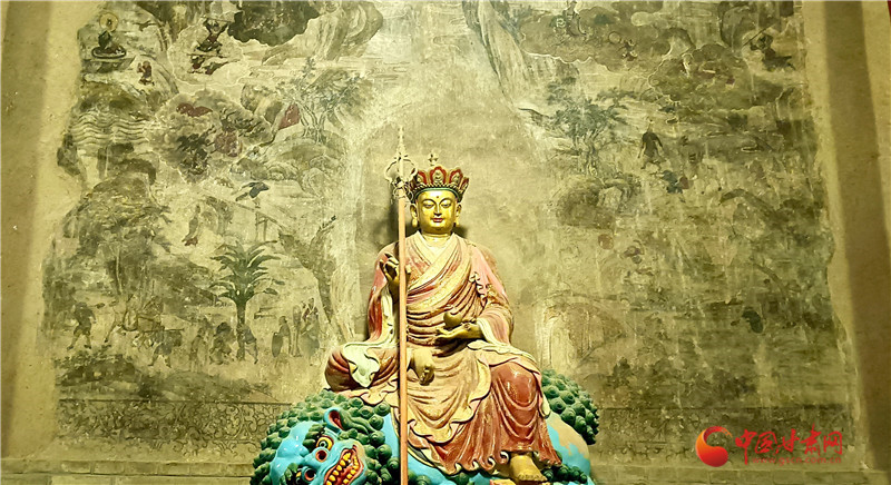 這幅壁畫繪于大佛殿內(nèi)大佛身后墻壁,色彩雖已斑駁,卻仍難掩其藝術(shù)價值,是大佛殿內(nèi)時代較早、藝術(shù)水準(zhǔn)極高的作品。它距地面高1.55米,上下兩端用墨線勾出邊欄,邊欄內(nèi)繪纏枝牡丹點綴;《西游記》故事圖居于正中,殘長約4.4米,殘高約2.9米,面積約12.7平方米,壁畫前今塑有地藏王菩薩像一尊。壁畫由“取水子母河”“道昧放心猿”“大戰(zhàn)紅孩兒”等多個獨立故事組成,畫面里險山怪石、古木溪水、云霧火海錯落交織,而師徒四人的分工設(shè)定始終清晰:豬八戒挑行李、沙僧牽馬、孫悟空持金箍棒護送,這份“固定分工”讓豬八戒的勤勞形象貫穿全程。