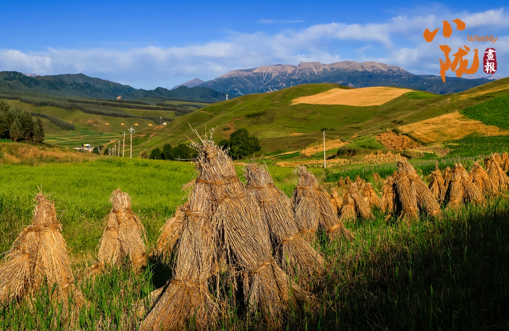 目之所及,金黃的麥捆與綠色相互映襯,用最燦爛最飽滿的顏色詮釋這片土地的豐收與希望。而遠(yuǎn)處連綿起伏的山巒,更是為這幅畫卷增添了幾分雄渾而壯闊。