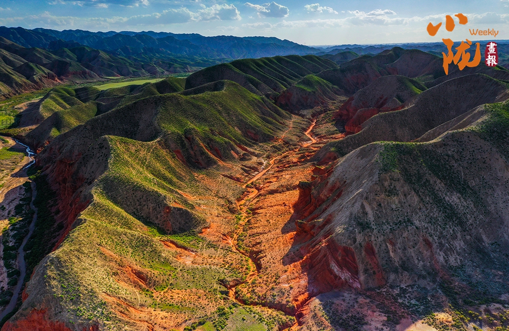 極目遠(yuǎn)眺,丹霞丘陵在廣袤的黃土高原上奔騰不息,猶如一座座火焰山。朱砂紅如烈焰燃燒,赭石黃似大地厚土,青黛綠若幽谷深潭,間或夾雜著沉穩(wěn)的灰褐,共同編織出一種難以言喻的斑斕與和諧。