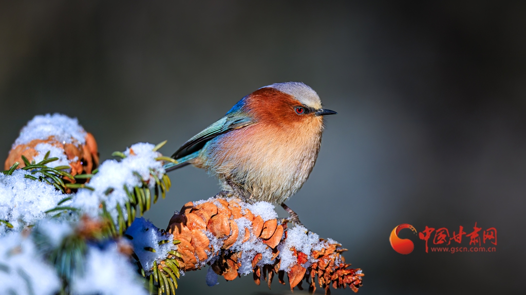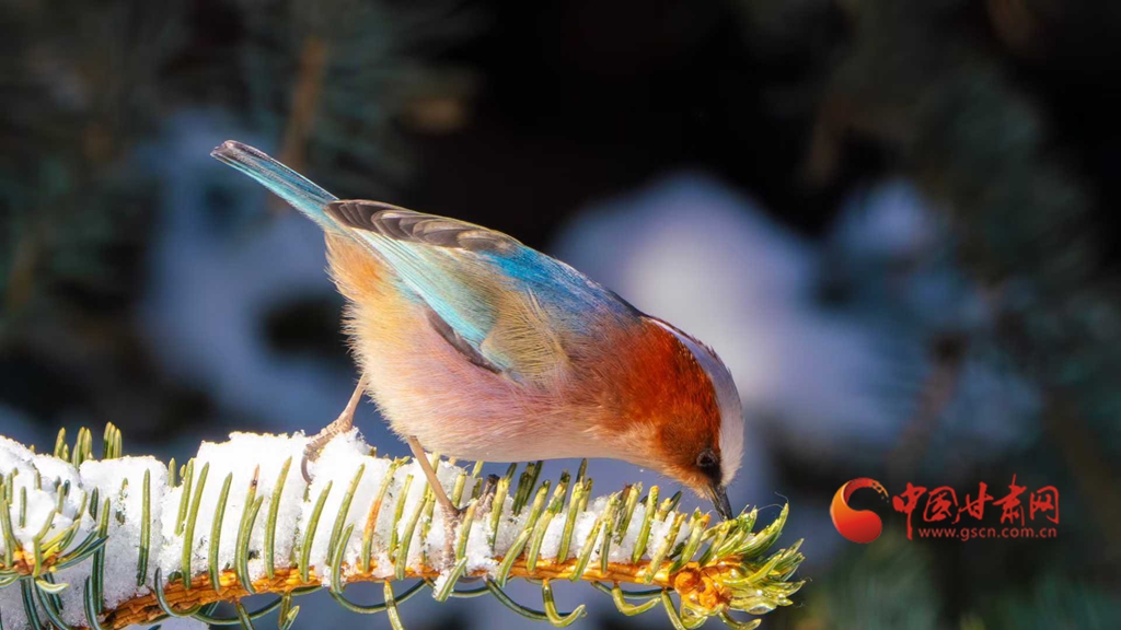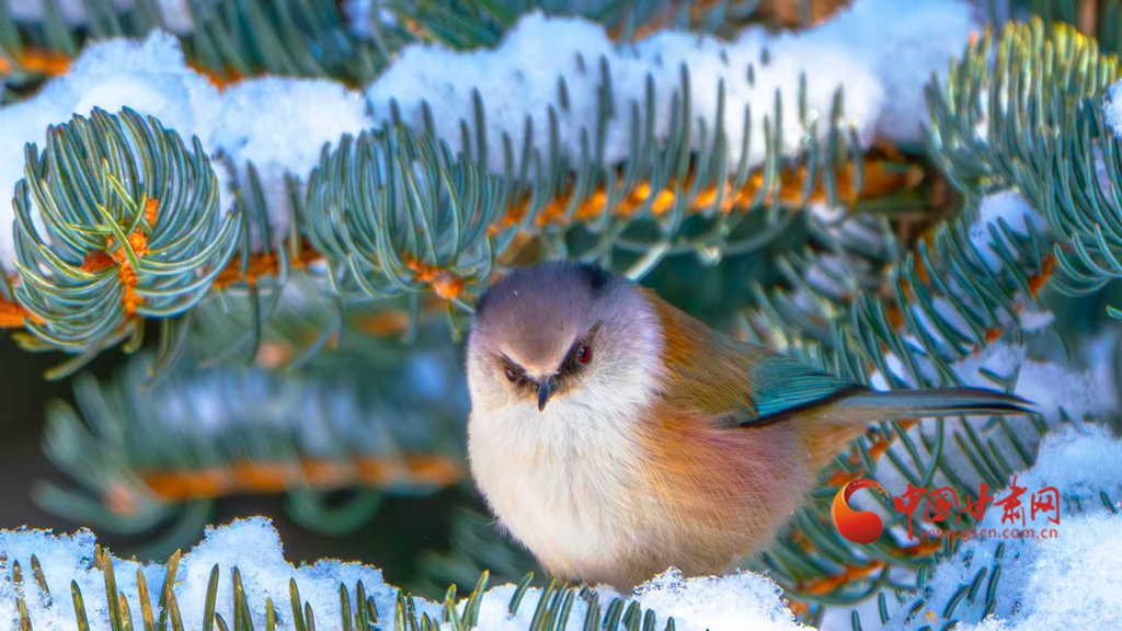 這群被譽為“祁連山精靈”的小鳥,頭頂雪白羽冠蓬松如絨,仿佛戴上了一頂天然的小絨帽,棕紅面頰溫潤似玉,在陽光下泛著柔和的光澤,藍綠背羽如同上好的寶石,在雪色映襯下泛著金屬般的質(zhì)感。淡粉與橙白相間的腹羽柔和雅致,層次分明,在純白背景的映襯下,形成強烈而和諧的視覺碰撞,它們或亭亭立于覆雪松枝,或靈巧穿梭于松針間隙,更有靈動的個體俯身探喙,啄取松針縫隙里的昆蟲,一聲輕脆的啄擊,劃破林間的清寂,卻更顯山野幽靜,羽翼輕振間,將“雪中覓食”的鮮活圖景永久定格。